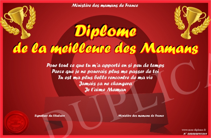 Envoyez par email votre Diplôme de la meilleure des Mamans personalisé