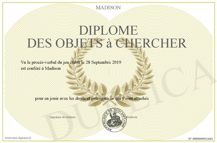 Envoyez par email votre Diplôme des objets à chercher personalisé