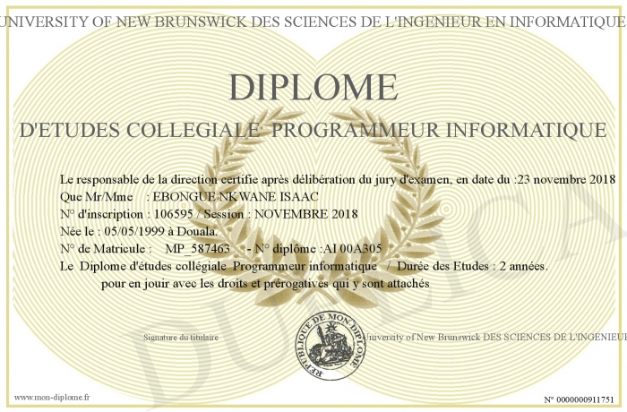 Envoyez par email votre Diplôme d'études collégiale Programmeur informatique personalisé