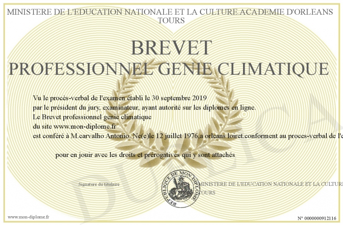 Envoyez par email votre Brevet professionnel genie climatique personalisé
