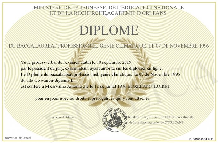Envoyez par email votre Diplôme du baccalaureat professionnel, genie climatique. Le 07 de Novembre 1996 personalisé