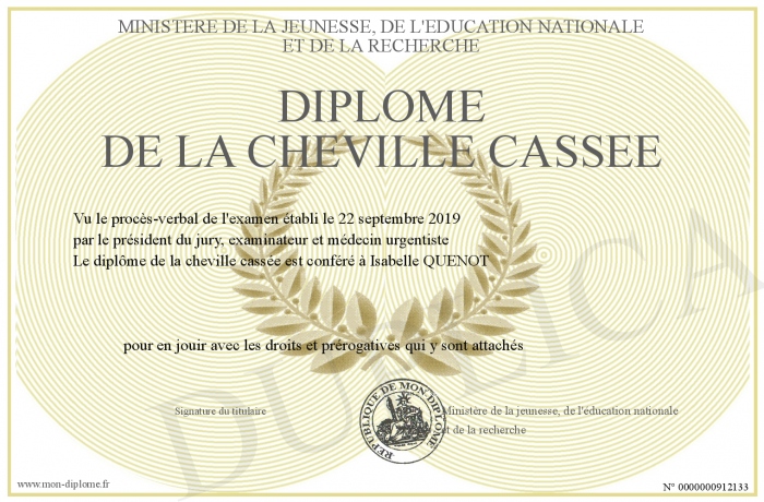 Envoyez par email votre Diplôme de la cheville cassée personalisé