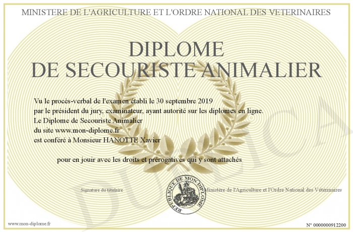 Envoyez par email votre Diplôme de Secouriste Animalier personalisé