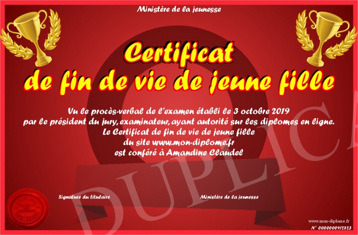 Envoyez par email votre Certificat de fin de vie de jeune fille personalisé