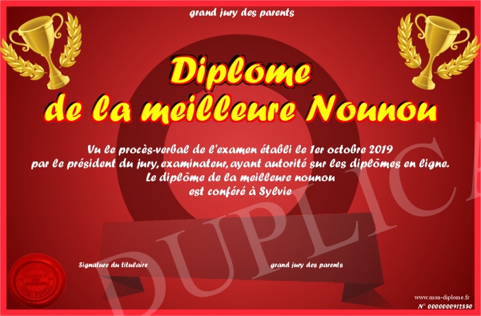 Envoyez par email votre Diplome de la meilleure Nounou personalisé