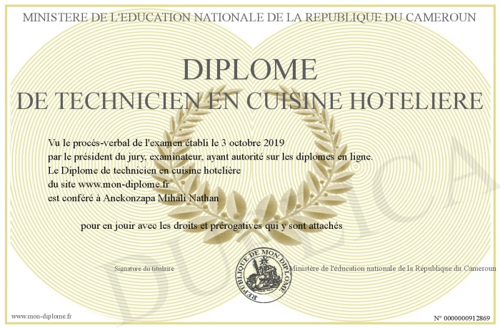 Envoyez par email votre Diplôme de technicien en cuisine hôtelière personalisé