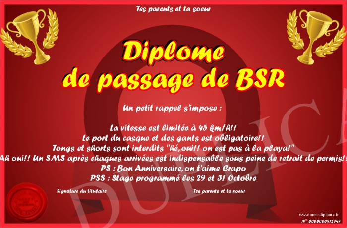 Envoyez par email votre Diplome de passage de BSR personalisé