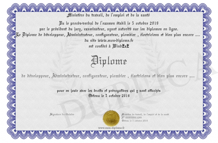 Envoyez par email votre Diplôme de développeur, Administrateur, configurateur, plombier , électriciens et bien plus encore .... personalisé