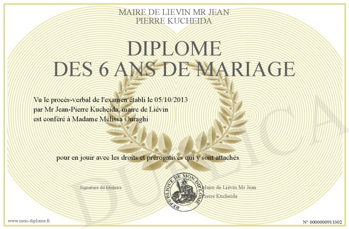 Envoyez par email votre Diplôme des 6 ans de mariage personalisé