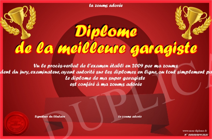 Envoyez par email votre Diplôme de la meilleure garagiste personalisé
