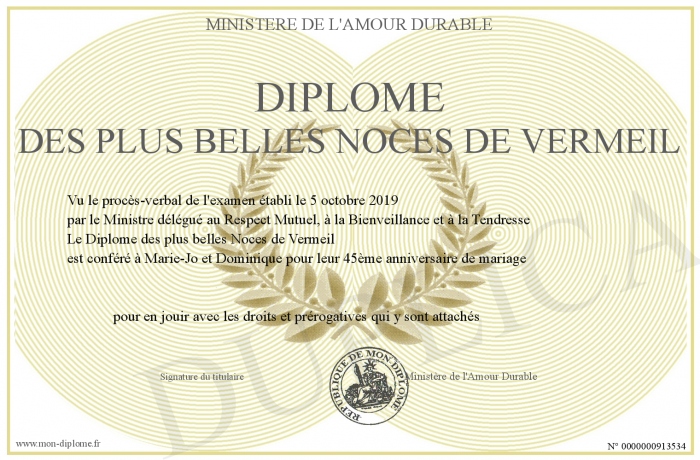Envoyez par email votre Diplôme des plus belles Noces de Vermeil personalisé