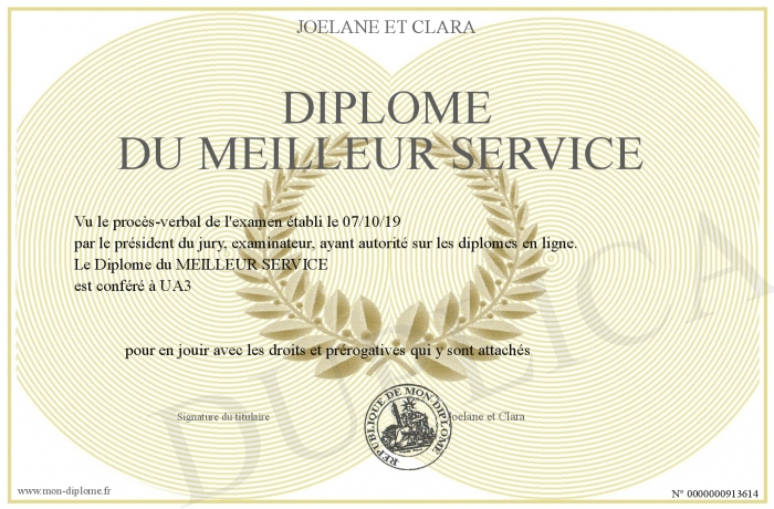 Envoyez par email votre Diplôme du MEILLEUR SERVICE personalisé
