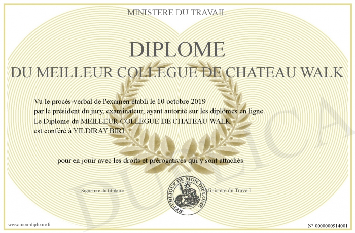 Envoyez par email votre Diplôme du MEILLEUR COLLEGUE DE CHATEAU WALK personalisé