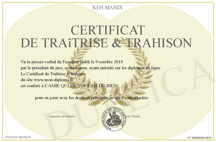 Envoyez par email votre Certificat de Traîtrise & trahison personalisé
