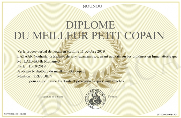 Envoyez par email votre Diplôme du meilleur petit copain personalisé