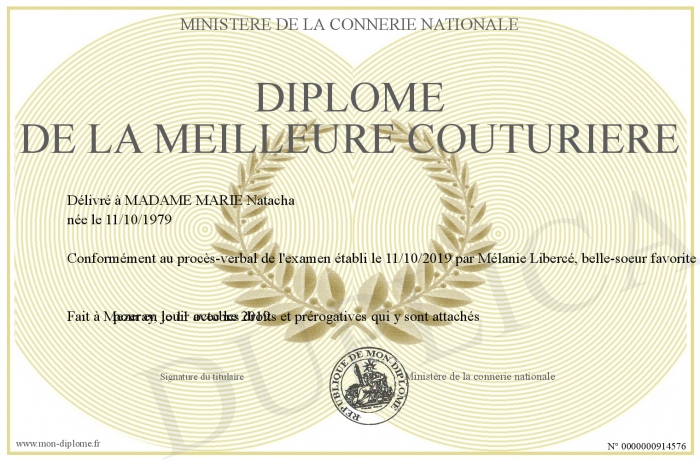 Envoyez par email votre Diplôme de la meilleure couturière personalisé