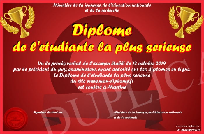 Envoyez par email votre Diplôme de l'etudiante la plus serieuse personalisé