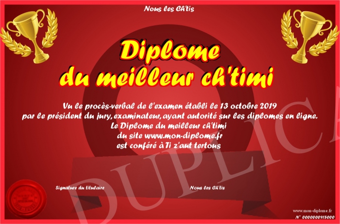 Envoyez par email votre Diplôme du meilleur ch'timi personalisé