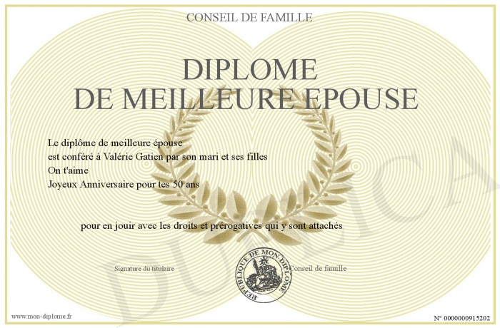 Envoyez par email votre Diplôme de meilleure épouse personalisé