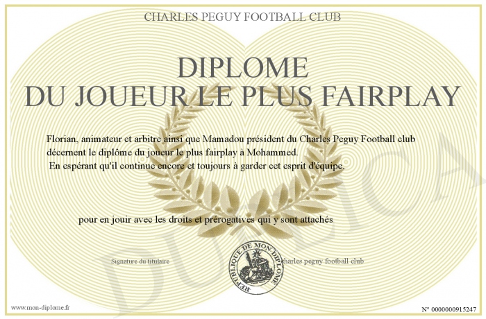 Envoyez par email votre Diplôme du joueur le plus fairplay personalisé