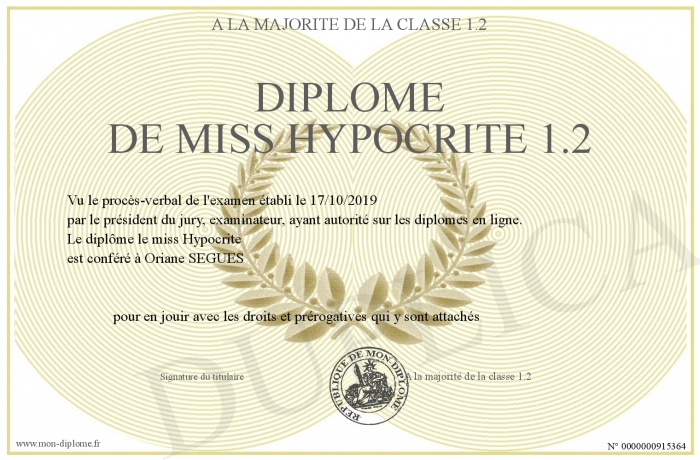 Envoyez par email votre Diplôme de miss hypocrite 1.2 personalisé