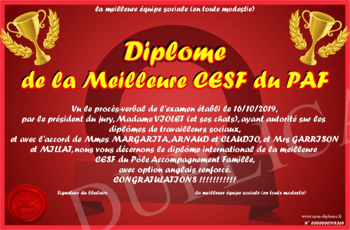 Envoyez par email votre Diplôme de la Meilleure CESF du PAF personalisé