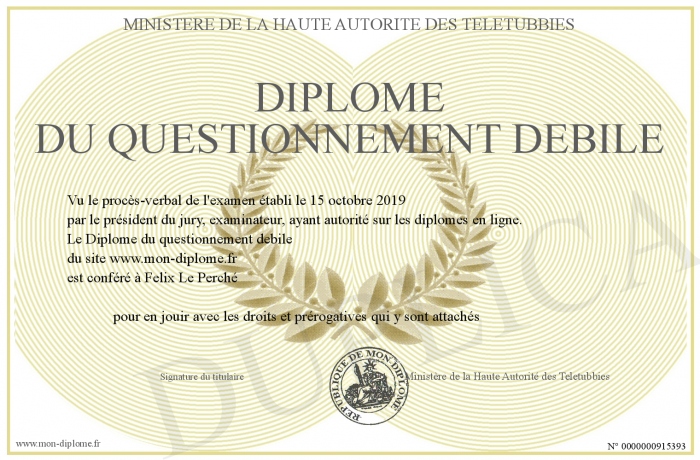Envoyez par email votre Diplôme du questionnement debile personalisé