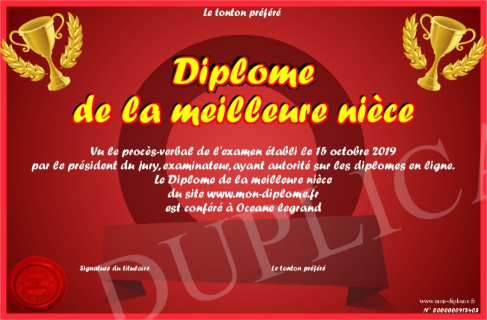 Envoyez par email votre Diplôme de la meilleure nièce personalisé