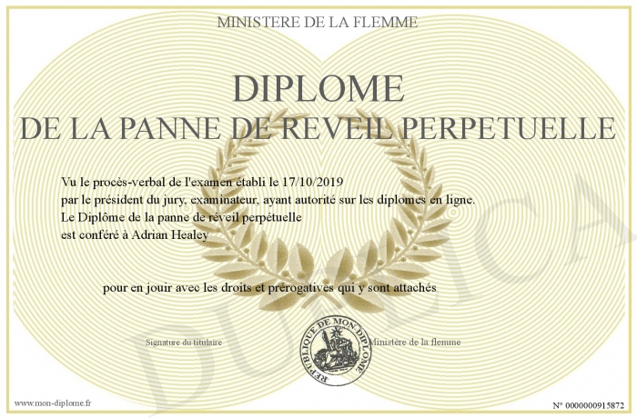 Envoyez par email votre Diplôme de la panne de réveil perpétuelle personalisé