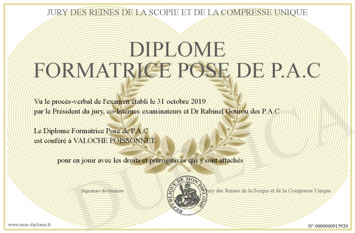 Envoyez par email votre Diplôme Formatrice Pose de P.A.C personalisé