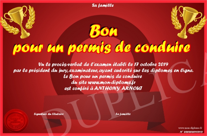 Envoyez par email votre Bon pour un permis de conduire personalisé
