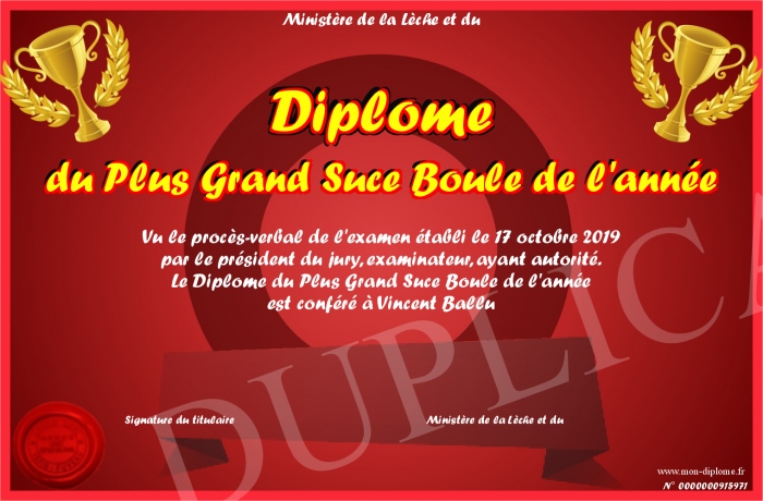 Envoyez par email votre Diplôme du Plus Grand Suce Boule de l'année personalisé