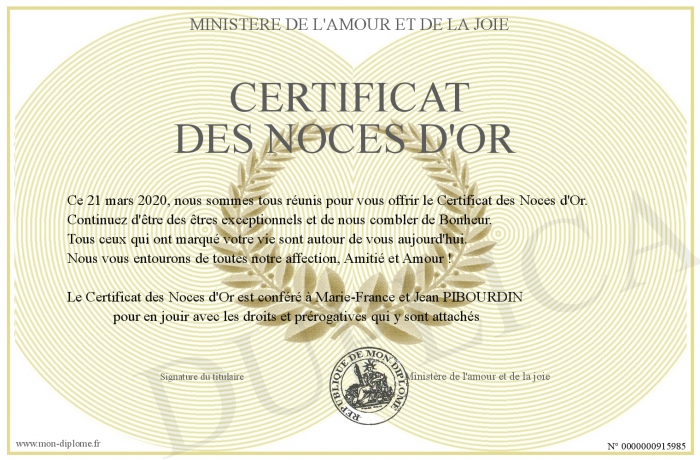 Envoyez par email votre CERTIFICAT DES NOCES D'OR personalisé
