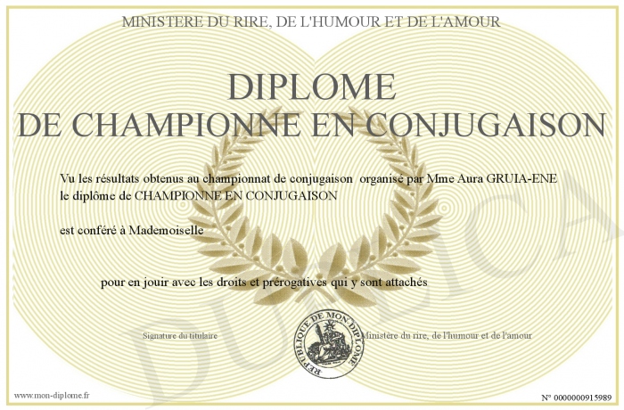 Envoyez par email votre Diplôme de championne en conjugaison personalisé