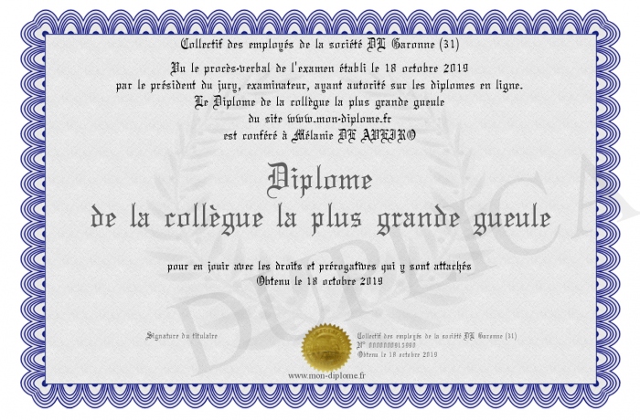 Envoyez par email votre Diplôme de la collègue la plus grande gueule personalisé