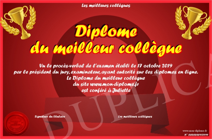 Envoyez par email votre Diplome du meilleur collègue personalisé