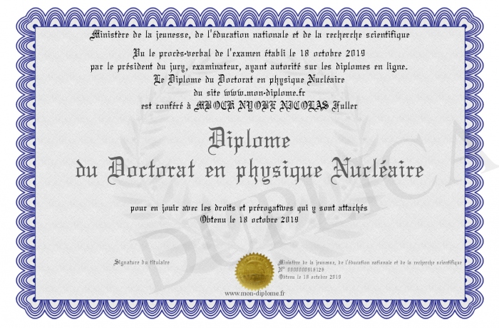 Envoyez par email votre Diplôme du Doctorat en physique Nucléaire personalisé