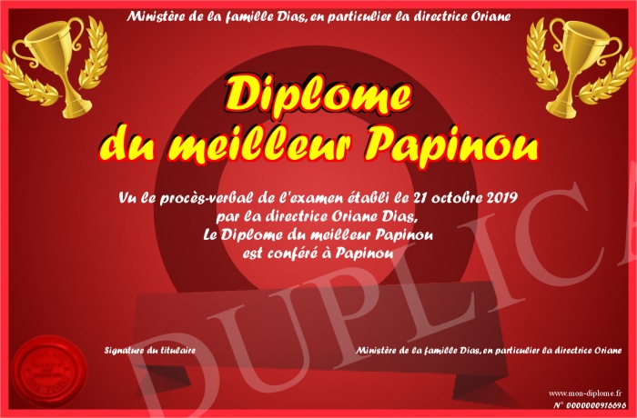 Envoyez par email votre Diplôme du meilleur Papinou personalisé