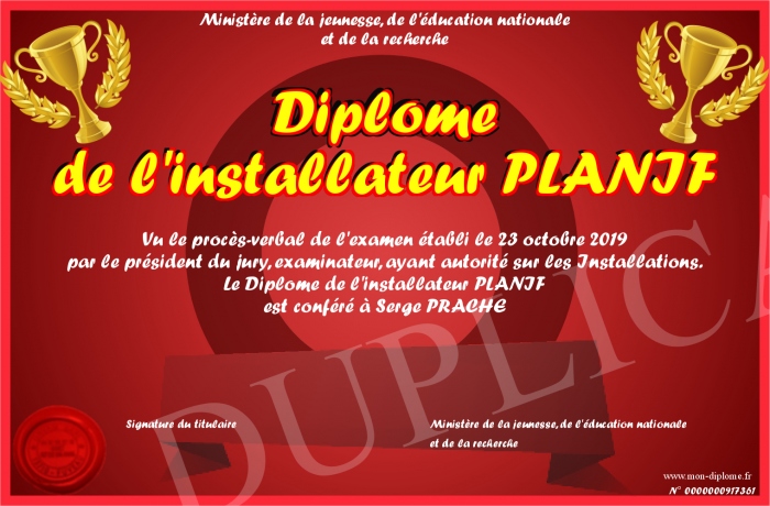 Envoyez par email votre Diplôme de l'installateur PLANIF personalisé