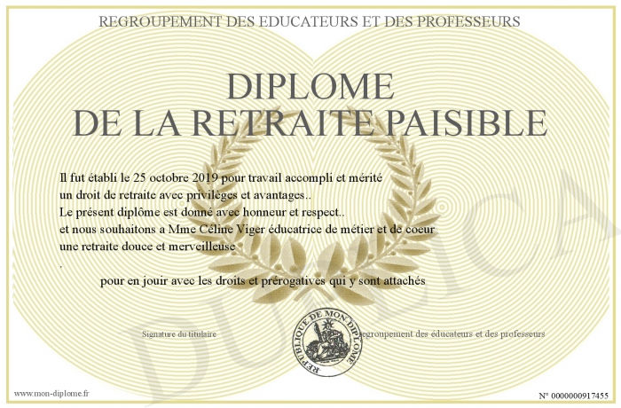 Envoyez par email votre Diplôme de la retraite paisible personalisé