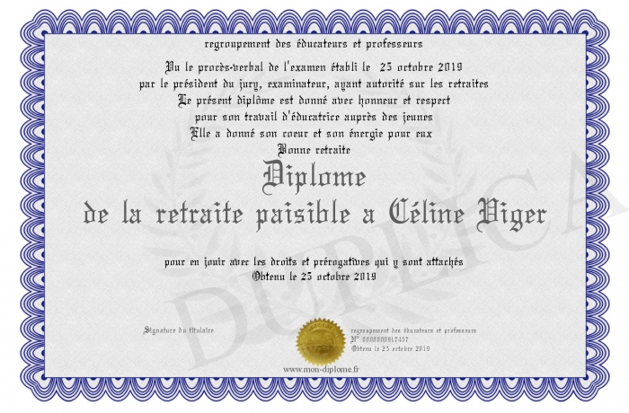 Envoyez par email votre Diplôme de la retraite paisible a Céline Viger personalisé