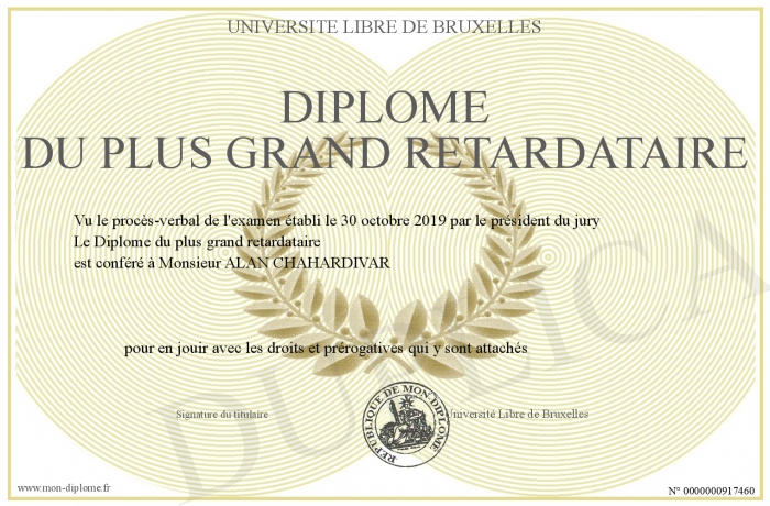 Envoyez par email votre Diplôme du plus grand retardataire personalisé