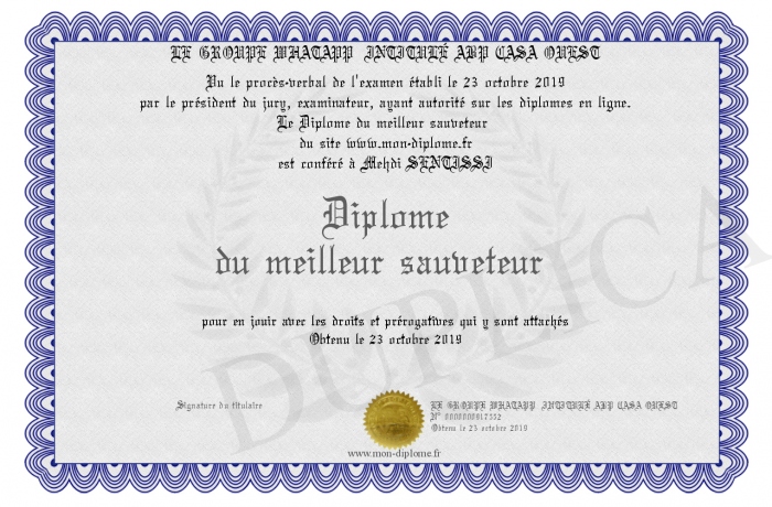 Envoyez par email votre Diplôme du meilleur sauveteur personalisé