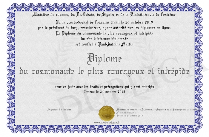 Envoyez par email votre Diplome du cosmonaute le plus courageux et intrépide personalisé