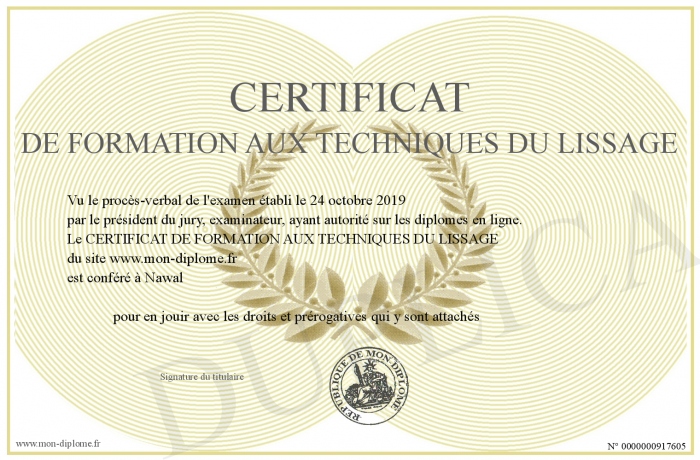 Envoyez par email votre CERTIFICAT DE FORMATION AUX TECHNIQUES DU LISSAGE personalisé