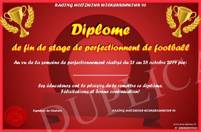 Envoyez par email votre Diplôme de fin de stage de perfectionnent de football personalisé