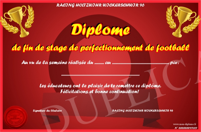 Envoyez par email votre Diplôme de fin de stage de perfectionnement de football personalisé