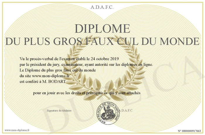 Envoyez par email votre Diplôme du plus gros faux cul du monde personalisé
