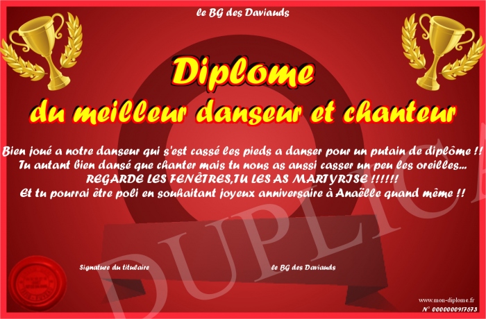 Envoyez par email votre Diplome du meilleur danseur et chanteur personalisé