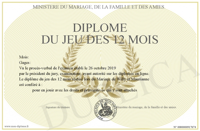 Envoyez par email votre Diplome du jeu des 12 mois personalisé